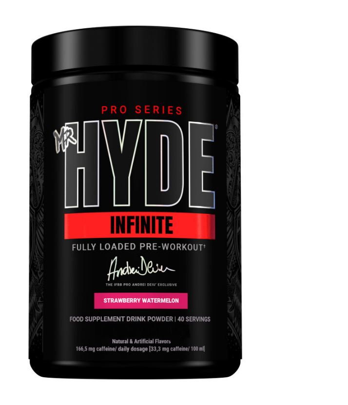 Mr. HYDE® Infinite Fully Loaded Pre-Workout reprezintă una dintre cele mai avansate formule din gama HYDE, concepută pentru antrenamente intense și utilizatori care își doresc performanță maximă. Fiecare doză furnizează ingrediente cheie în cantități eficiente: 5 g L-citrulină pentru pompare și vascularizare, 3,2 g beta-alanină pentru reducerea oboselii musculare, 3 g creatină pentru forță și performanță, precum și aproximativ 166 mg cofeină provenită dintr-un mix de surse pentru energie rapidă și susținută.