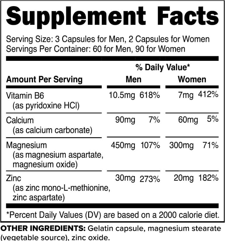 Ingrediente: Vitamina B6 (sub formă de clorhidrat de piridoxină),Calciu (sub formă de carbonat de calciu),Magneziu (sub formă de aspartat de magneziu și oxid de magneziu),Zinc (sub formă de mono-L-metionină de zinc și aspartat de zinc),Capsulă din gelatină,Stearat de magneziu (sursă vegetală),Oxid de zinc